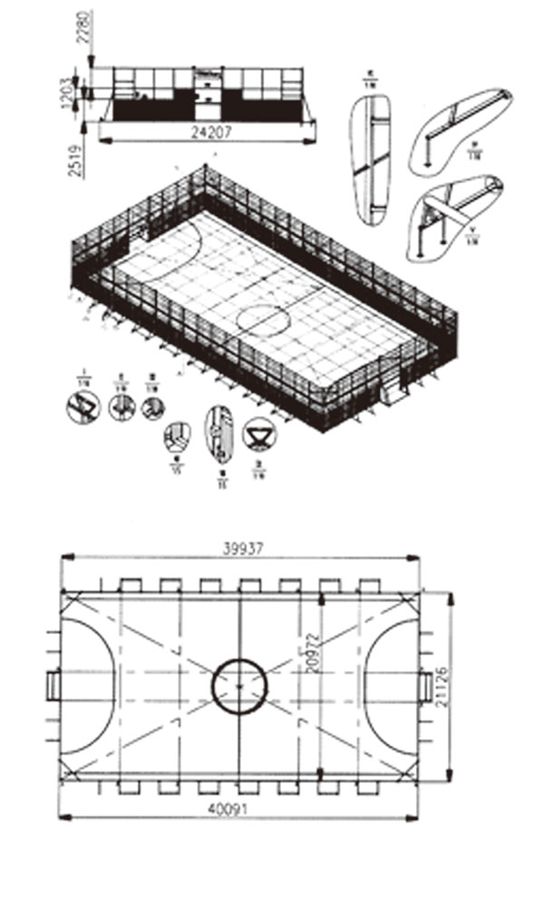 1、场地基础面积尺寸,须在球场尺寸外围扩展至少3米,用于外围框架延伸安装使用。